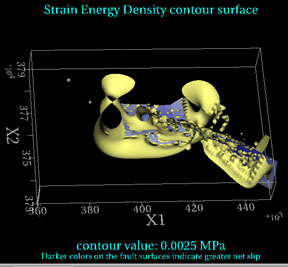 Three-dimensional VRML models of strain energy density around the faults at each stage of evoltuion: